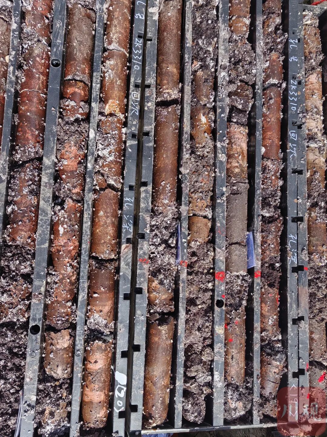 不过,牦牛坪矿区岩性复杂、岩体破碎、裂隙发育、地下水文条件复杂。再加上稀土矿岩芯质地偏软,触感近似黏土,一用力就会像饼干一样碎成粉末。越进入地壳深部,钻杆会像柔软的面条一般难以把控,给勘探工作带来一定考验。记者了解到,硬岩岩芯可通过敲击内管取出,稀土矿岩芯要靠高压气流吹出来,每一份样品的获取都来之不易。